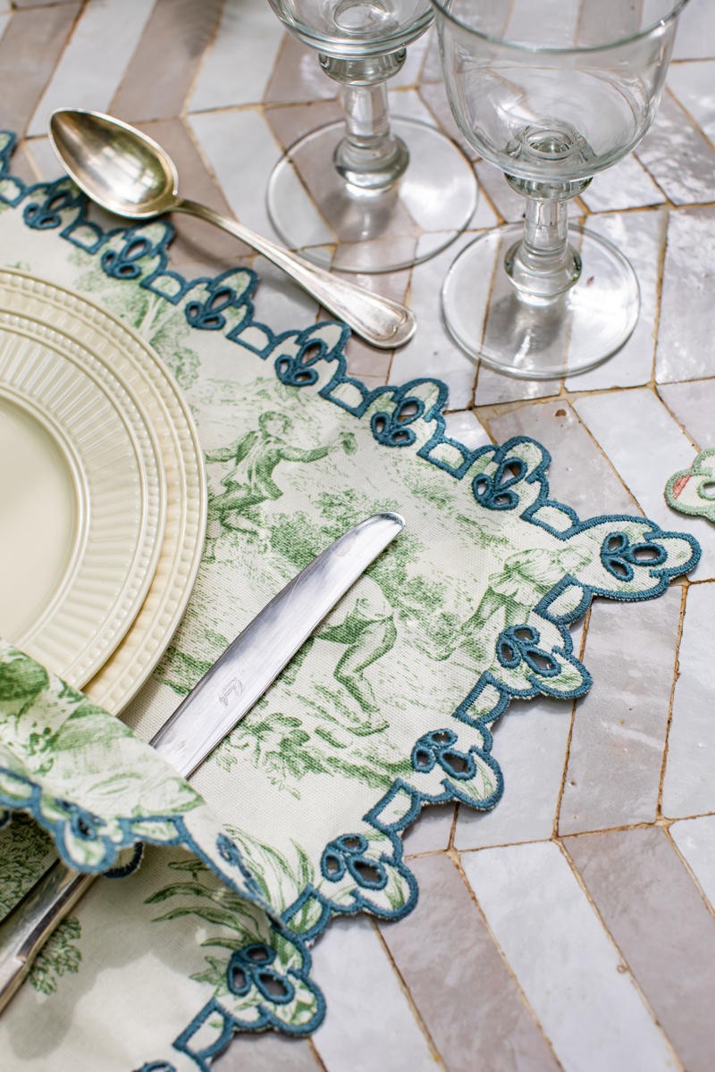 Tovaglietta in puro lino trattato antimacchia ricamata ad intaglio a contrasto di colore sul profilo. Perfetta per apparecchiare con eleganza una tavola della colazione, o un pranzo, ma elegantissima anche sovrapposta ad una tovaglia Amalfi con il bordo riccamente ricamato con lo stesso motivo per allestire una tavola adatta a qualsiasi evento. Completa la tua apparecchiatura con i tovaglioli coordinati. La tovaglietta Amalfi è praticissima da pulire perché dotata del nostro speciale trattamento antimacchia.