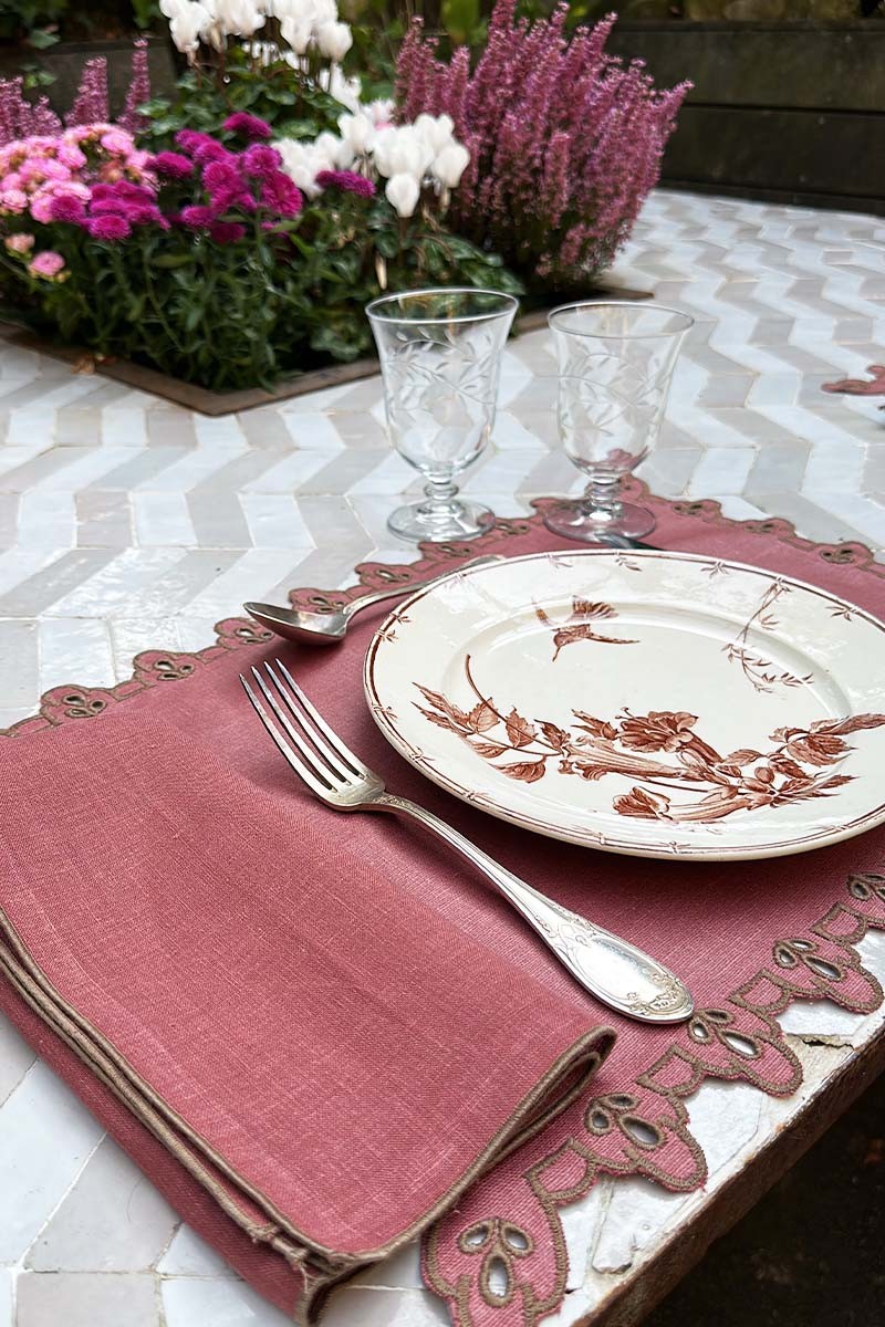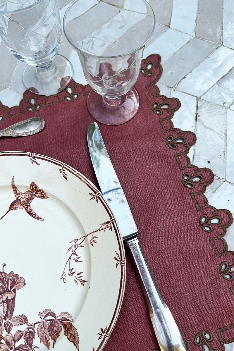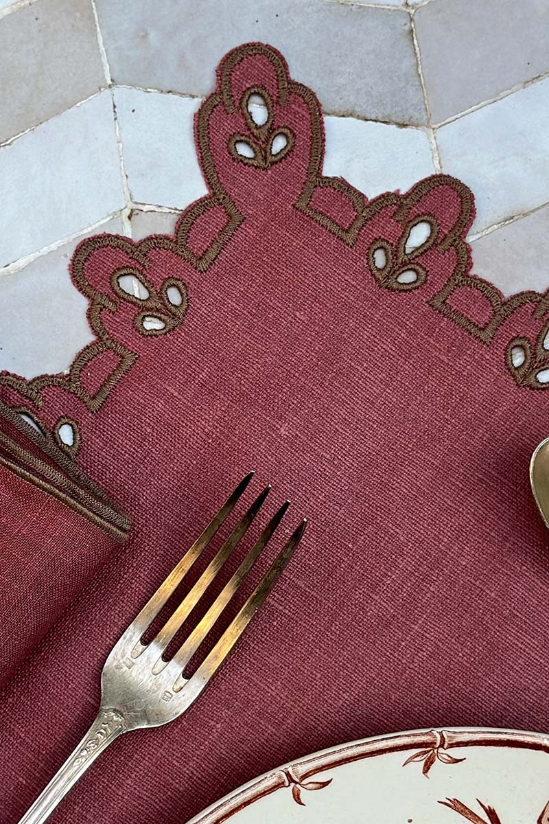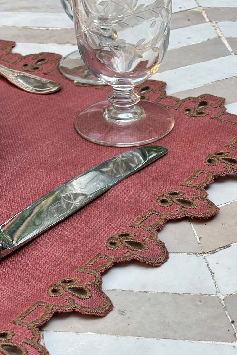 Tovaglietta in puro lino trattato antimacchia ricamata ad intaglio a contrasto di colore sul profilo. Perfetta per apparecchiare con eleganza una tavola della colazione, o un pranzo, ma elegantissima anche sovrapposta ad una tovaglia Amalfi con il bordo riccamente ricamato con lo stesso motivo per allestire una tavola adatta a qualsiasi evento. Completa la tua apparecchiatura con i tovaglioli coordinati. La tovaglietta Amalfi è praticissima da pulire perché dotata del nostro speciale trattamento antimacchia.