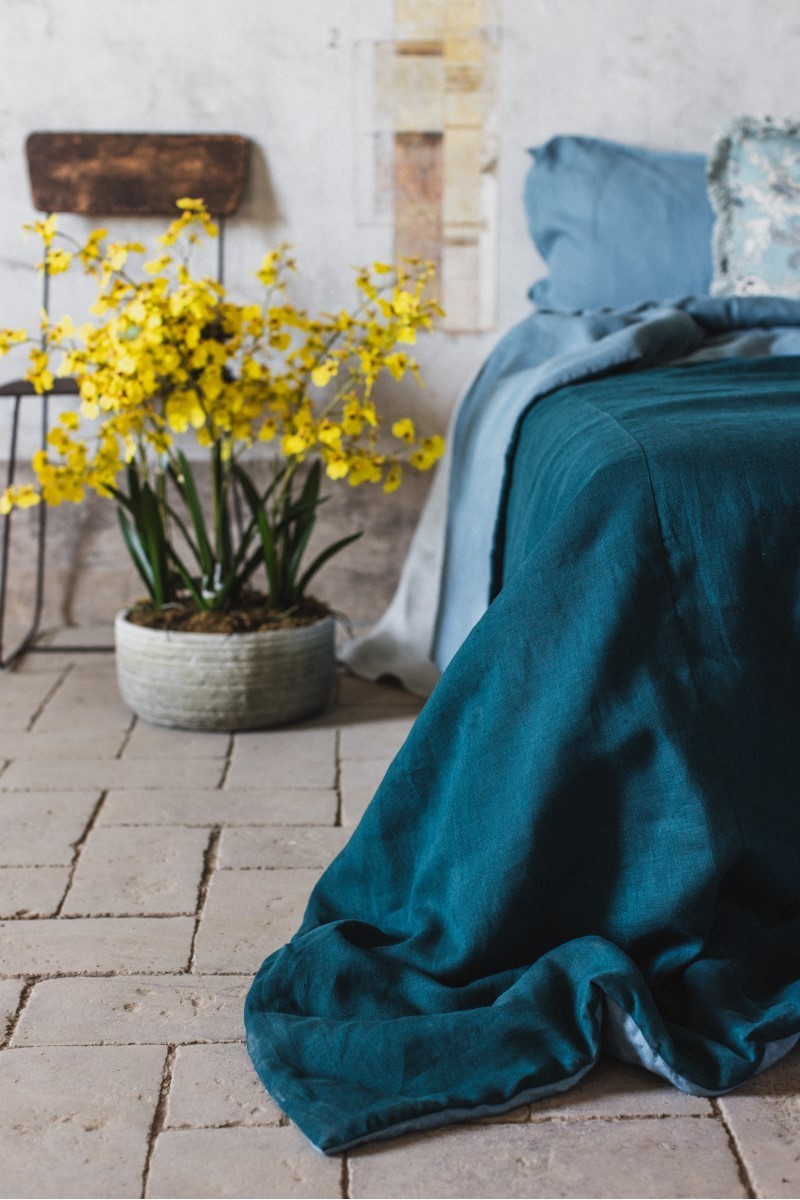 Les couvre-lits de la ligne Pure de Borgo Delle Tovaglie sont des produits polyvalents qui vous accompagneront longtemps. Bicolores et réversibles, ils sont conçus pour que vous puissiez, d'un simple geste, changer l'aspect de votre lit de manière polyvalente. Vous pouvez les combiner avec des draps et des oreillers en lin dans les mêmes tons ou dans des combinaisons uniques qui reflètent votre goût, à choisir dans notre vaste gamme de couleurs. Fabriqués à la main en Italie, ils sont garnis de Dacron doux et chaud. Disponibles en deux poids : 120 g/m² et 200 g/m², ils conviennent à toutes les saisons.Ils sont fabriqués à la main dans notre atelier de Bologne, avec des tissus et des finitions de qualité supérieure, et peuvent également être réalisés sur mesure, comme la plupart de nos produits. L'entretien est rapide et facile car il ne nécessite pas de repassage ! Il ne vous reste plus qu'à vous détendre et à faire de beaux rêves.