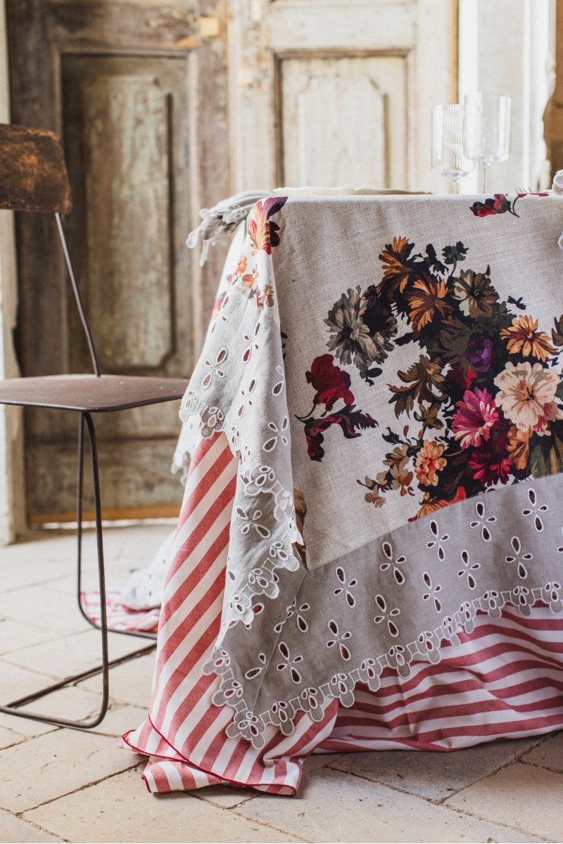 Nappe en toile de lin viscose imprimée. Bordure contrastée brodée en pur lin et entièrement sculptée à la main. Notre nappe de la ligne Amalfi convient pour dresser des tables élégantes et éclectiques, pleines de personnalité. Une nappe originale qui ne passera pas inaperçue. Réalisée dans de nombreuses tailles, elle est également personnalisable grâce à notre service sur mesure très efficace. Fabriqué à la main en Italie