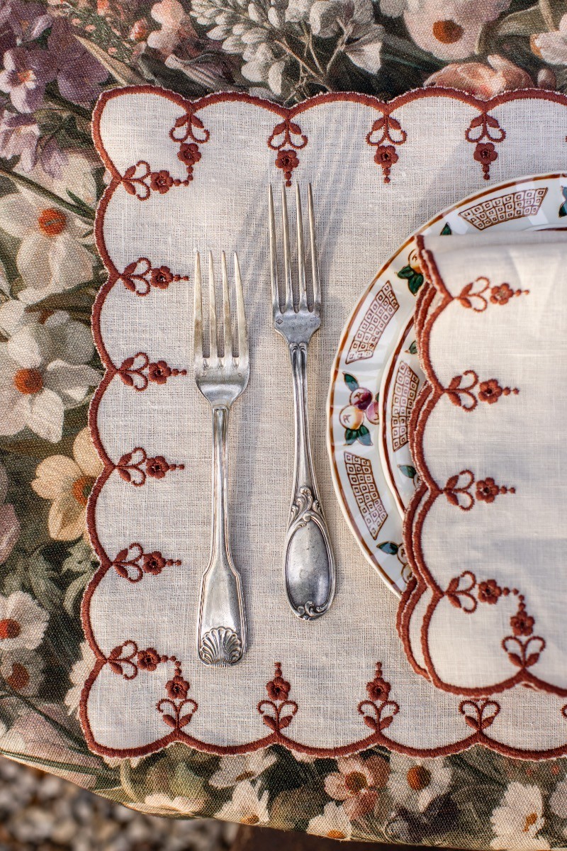 Tovaglietta in puro lino riccamente ricamata con un delicato motivo che richiama l'eleganza dei tempi passati.