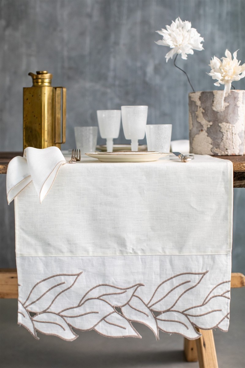 Tapis de passage élégant avec une bordure haute en lin agrémentée d'une élégante broderie de feuilles de couleur contrastée. Fabriqué artisanalement en Italie, dans notre atelier de couture à Bologne, il ne passera pas inaperçu. Associez-le aux serviettes coordonnées pour compléter votre table de manière originale et créative. Le chemin de table Venezia donnera une touche de raffinement à votre table sans la cacher. Disponible aussi bien dans la version en tissu naturel qu'avec notre traitement spécial antitache qui le rend très simple à entretenir : simplement lavable avec une éponge humide, il rendra votre quotidien plus léger et chaque occasion d'invitation plus agréable.