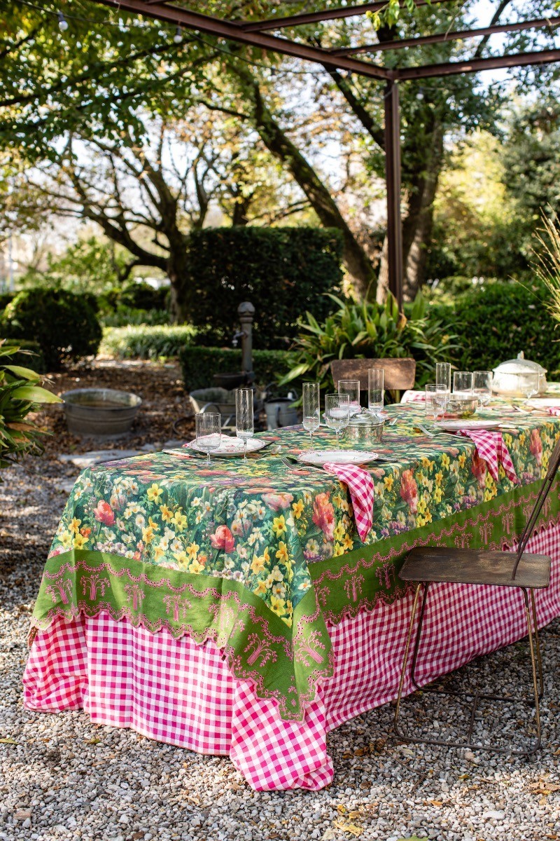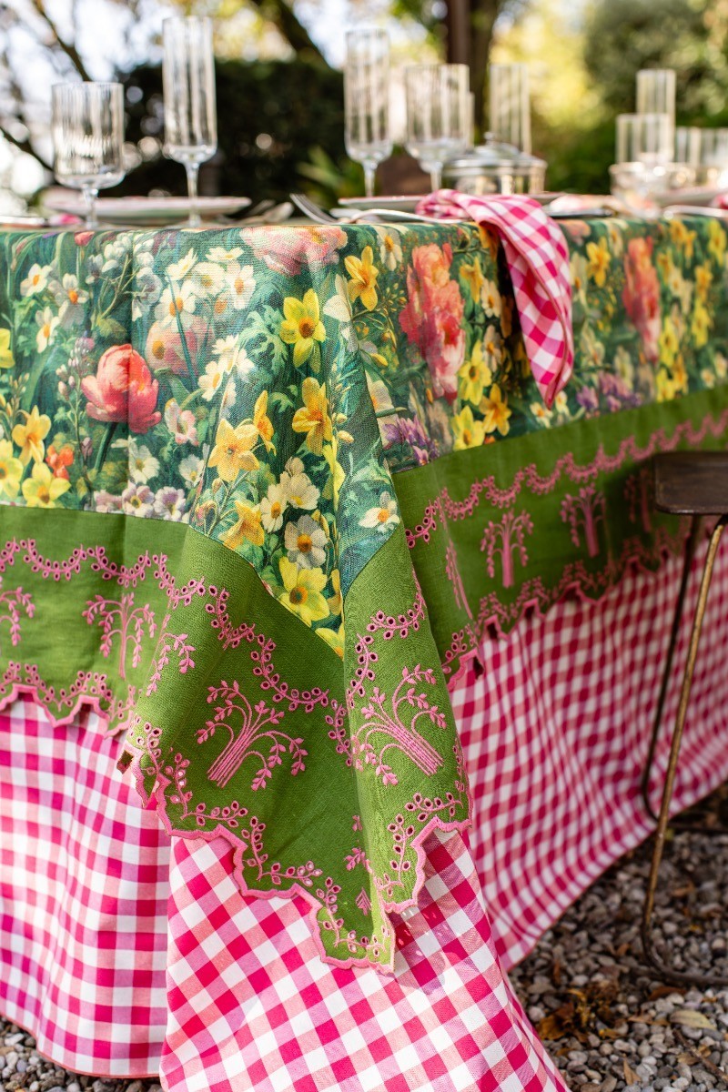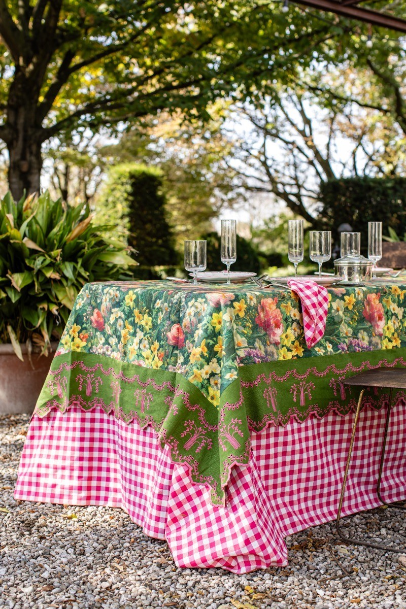 La tovaglia Eden ha un alto bordo riccamente ricamato ad intaglio a contrasto di colore che si ispira ai mitici giardini dell’Eden con ghirlande di alberi e foglie. La scelta dei colori ed il raffinato ricamo fanno di questa tovaglia un modello unico, molto eclettico che darà un carattere di originalità alla tua tavola. Le nostre tovaglie vengono realizzate artigianalmente su misura per te nella nostra sartoria di Bologna, in Italia. Per semplificarti la scelta trovi online le taglie più richieste, se tra queste non dovessi trovare quella giusta per te, contattaci per un preventivo ad hoc, abbiamo sicuramente la soluzione giusta per la tua tavola. Questa tovaglia può essere realizzata sia in tessuto naturale che con il nostro speciale trattamento antimacchia. Nella versione con trattamento antimacchia mantiene la sua eleganza offrendo una praticità di manutenzione ineguagliabile: lavabile semplicemente con una spugna umida, renderà leggero il vostro quotidiano e più piacevole ogni occasione di invito, non farete in tempo a sparecchiare che la tovaglia sarà pronta per il prossimo utilizzo. Il materiale del bordo, sempre in tessuto naturale, varia in funzione dello specifico abbinamento, utilizziamo sempre i migliori tessuti per darvi il miglior prodotto. Segui la nostra guida alle taglie per scegliere la misura più adatta al tuo tavolo o contattaci se desideri un accurato servizio su misura per creare tavole perfette per la prossima cena, pranzo o colazione in famiglia o con gli amici. Abbina i tovaglioli coordinati e aggiungi le tovagliette all''americana per creare un'apparecchiatura nuova e personale, con un forte carattere distintivo. Whatsapp +39 388 489 0731 / e-mail info@borgodelletovaglie.com